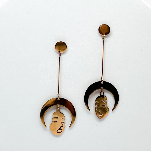 — A slender gold stem connects stunning gold arcs that frame a beautifully sculpted face.